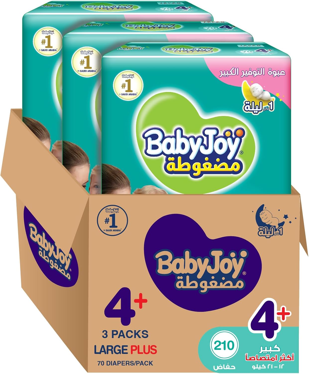 -33%بيبي جوي بالحشوة الماسية المضغوطة,عبوة التوفير الكبيرة , مقاس كبير + , مقاس 4+ , 70x3 حبة, من 12 كيلو لغاية 21 كيلو