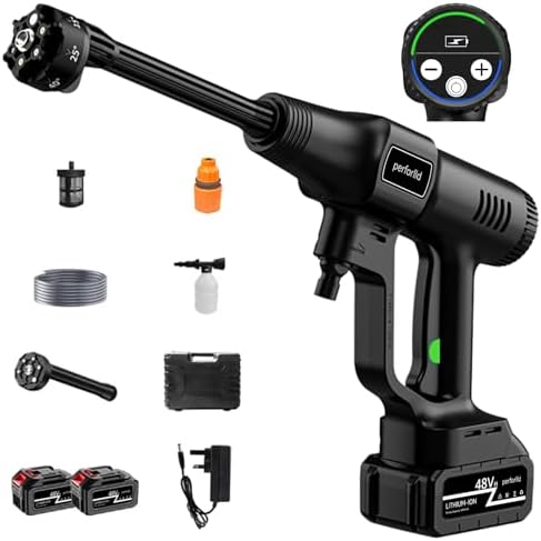 مسدس غسيل لاسلكي بالضغط العالي، مع آلة غسل محمولة تعمل ببطاريتين 4.0 أمبير في الساعة مع فوهة ومُكون رغوة وفوهة 6 × 1 لضخ الماء لغسل السيارة والمنزل والحديقة.
