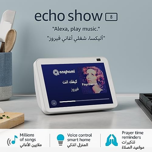 Echo Show 8 (الجيل الثاني) | شاشة ذكية 8" انش بالبلوتوث مع أليكسا | استخدم صوتك للتحكم بالأجهزة المنزلية الذكية، وتشغيل تلاوة القرآن أو الموسيقى، وغيرها (متوفر الآن باللهجة الخليجية) | أبيض